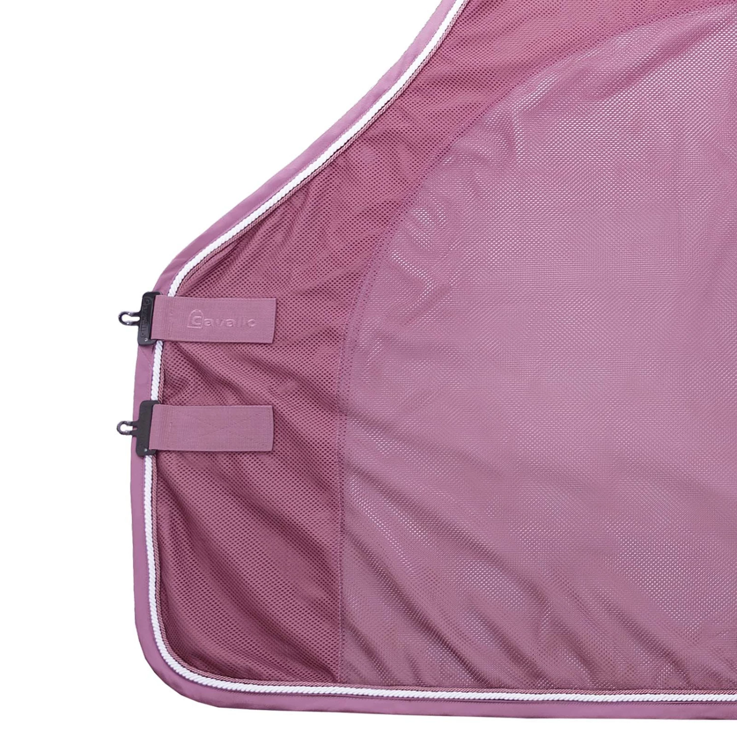 Funktionelle Fliegendecke aus engmaschigem Netzmaterial für einen optimalen Schutz vor Insekten. Am vorderen Abschluss und auf dem oberen Rücken sorgt ein atmungsaktives Mesh-Gewebe für einen optimalen Feuchtigkeitstransport. Zwei T-Brustverschlüsse vorne garantieren sicheren Halt. Die abnehmbare, doppelte Kreuzbegurtung ermöglicht eine perfekte Fixierung der Decke. An beiden Rückseiten befinden sich zwei tonige, vertikale Streifen aus edel schimmerndem Satin sowie zwei große, glänzende Cavallo Drucke in Gummioptik in glitzerndem Silber. Die Drehhakenverschlüsse sind alle in Gunmetal gehalten und versehen mit einem Kristall sowie dem eingeprägtem Cavallo Logo. Die Decke ist eingefasst mit zwei unterschiedlich breiten Kordeln, von denen eine tonig und eine in Weiß gehalten ist. Im Bereich des Schweifes ist die Decke mit einem abnehmbaren Band zu fixieren.
